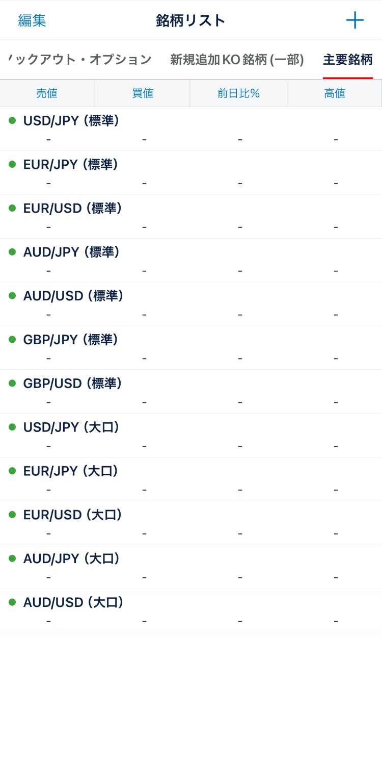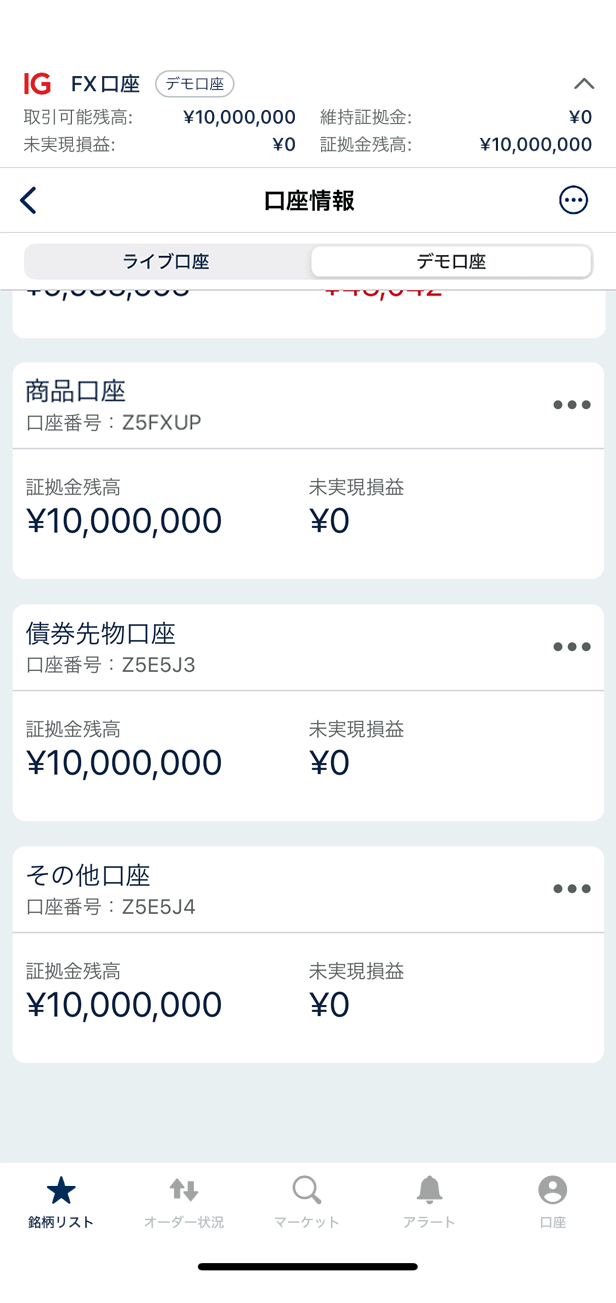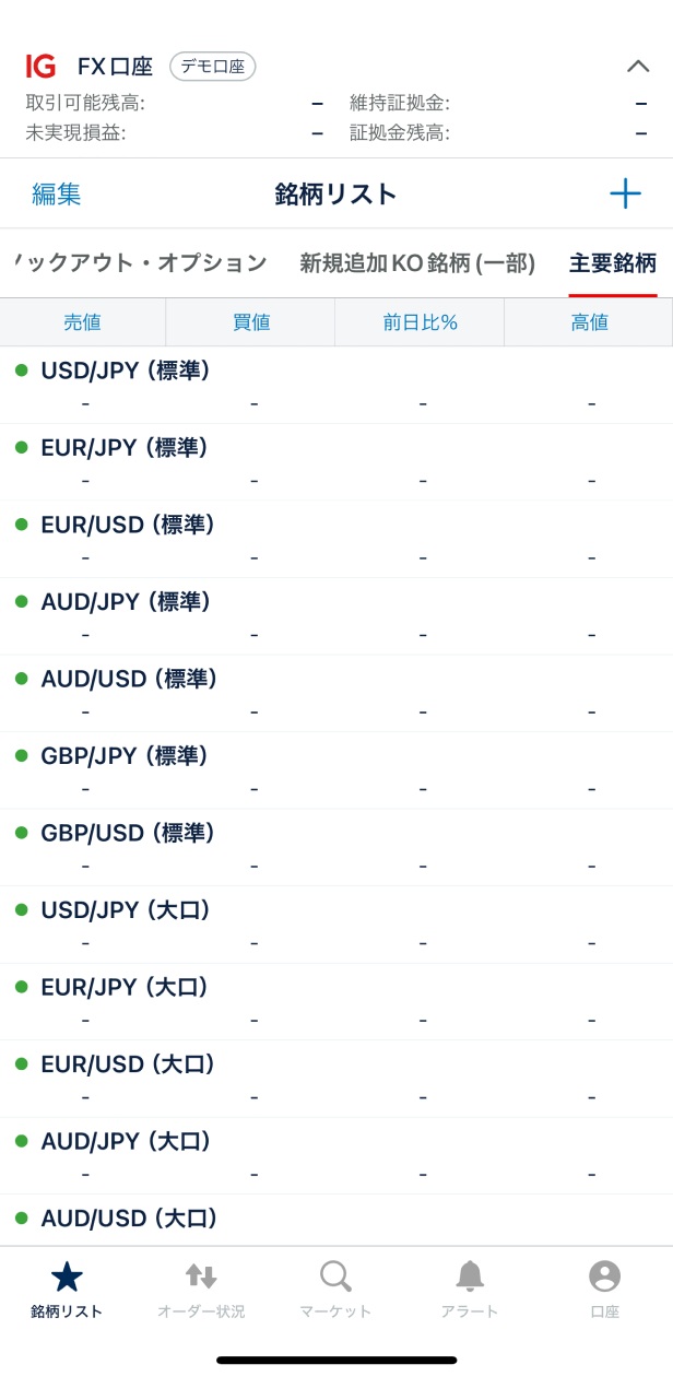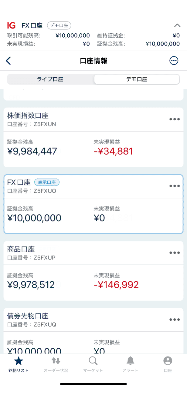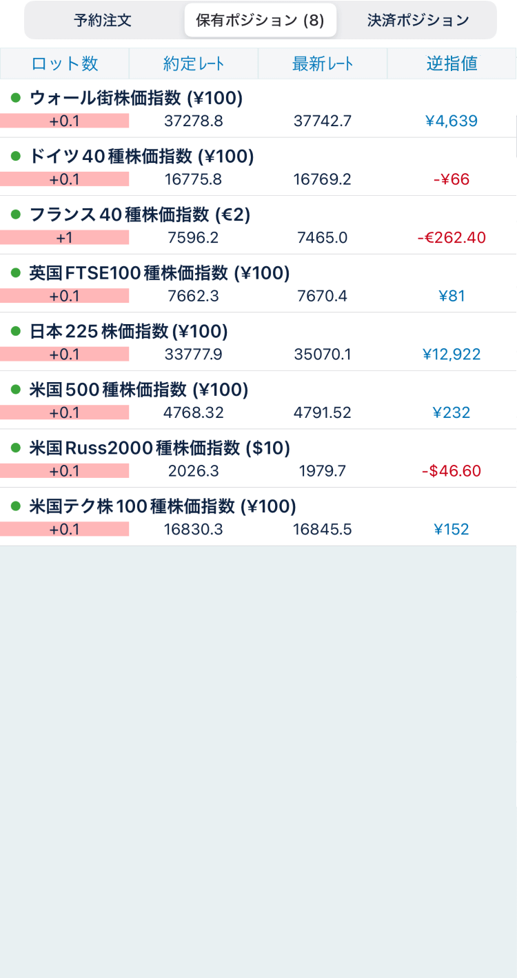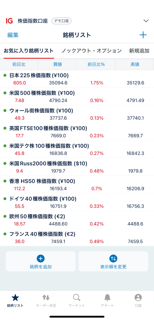 株価指数口座に切替わりました。「銘柄リスト」を開き、取引する銘柄を選びます。