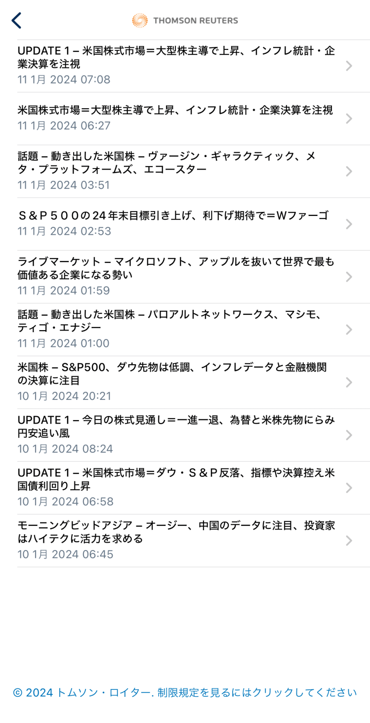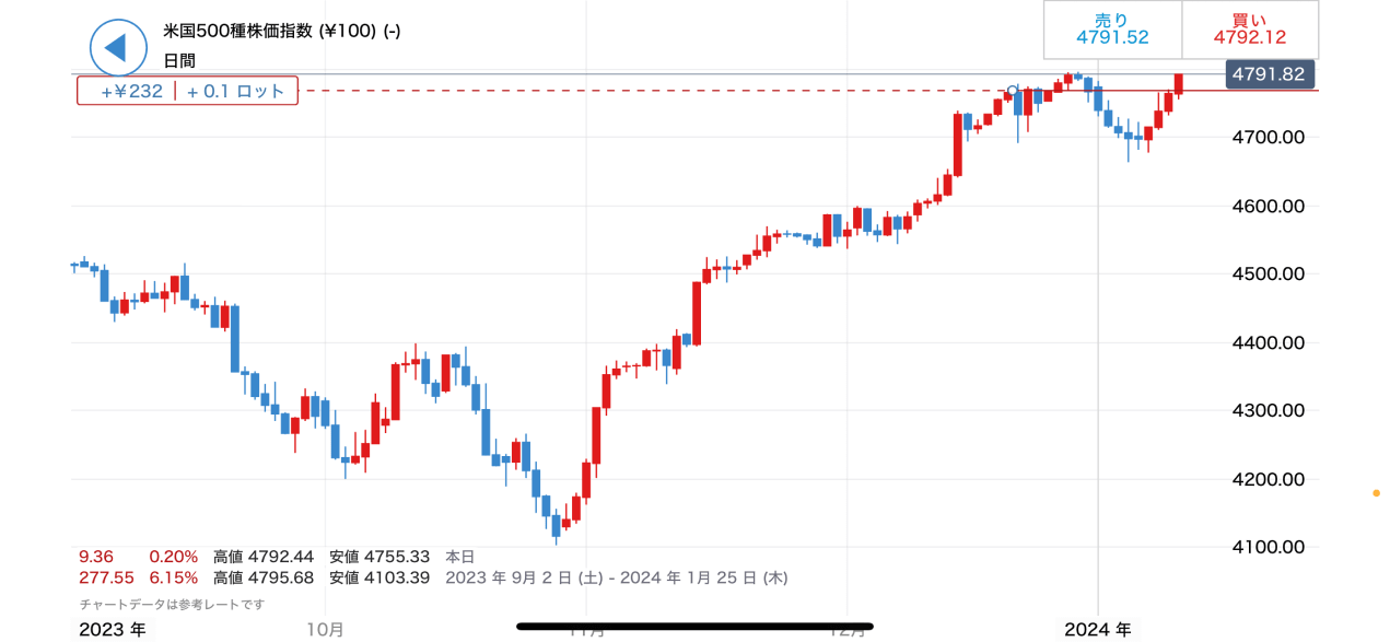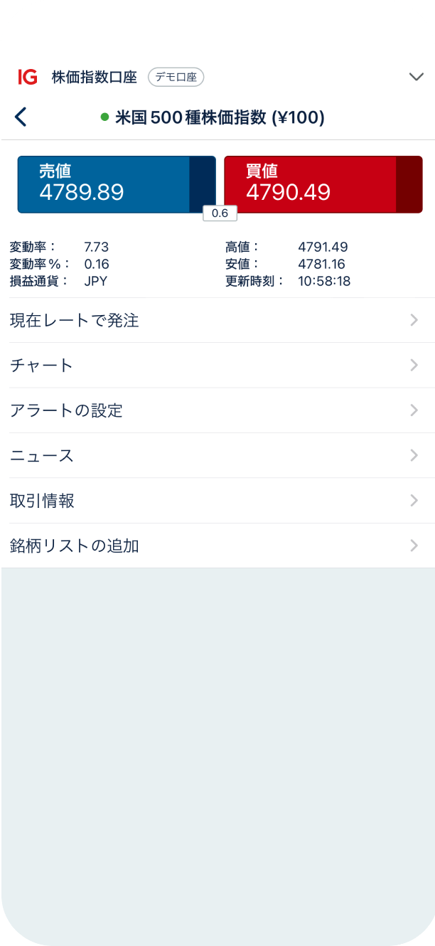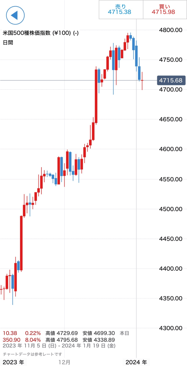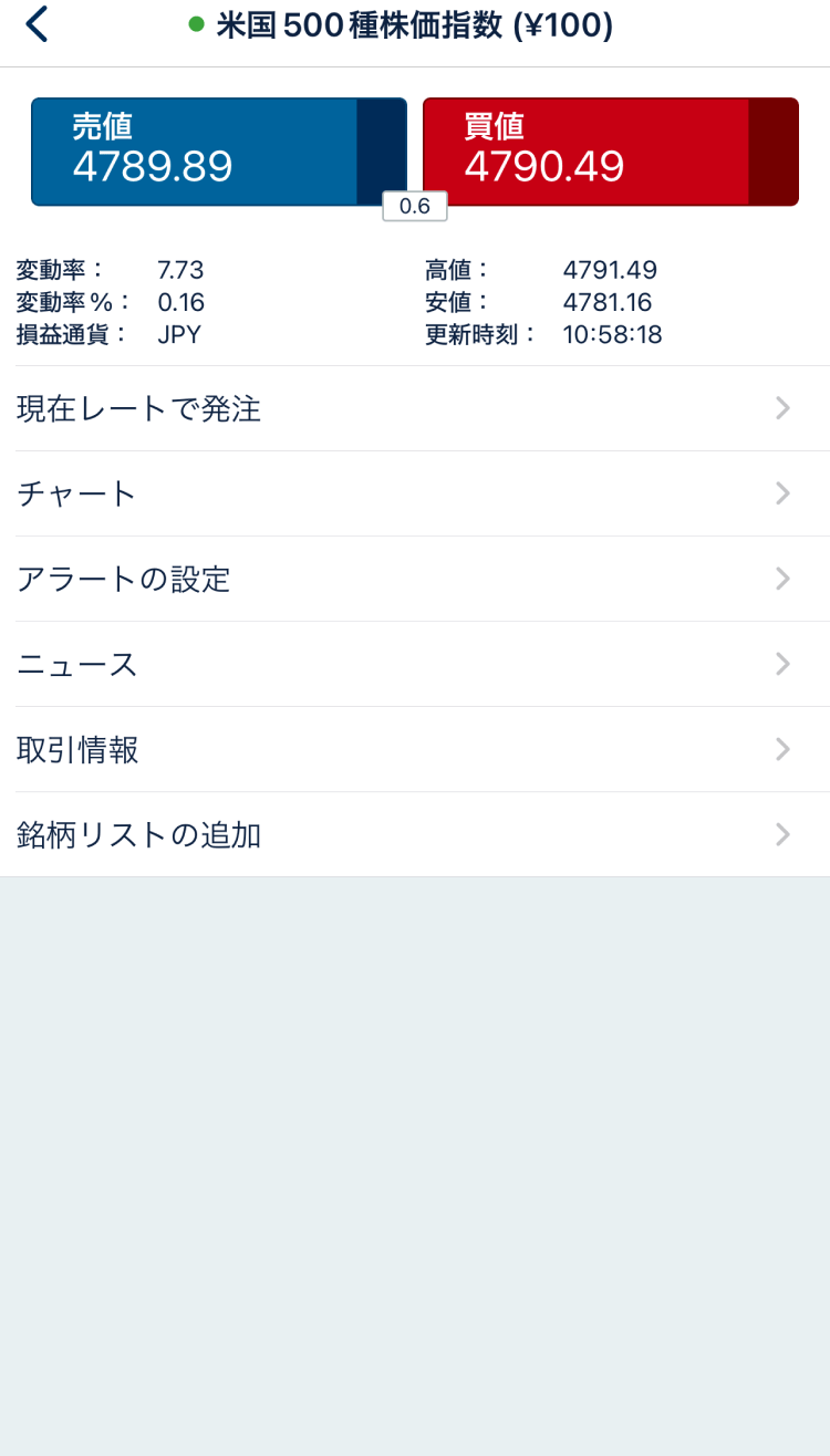 この画面では、現在の「買値」「売値」から、「米国500種株価指数(¥100) 」銘柄のチャート、関連ニュースまで見ることができます。
