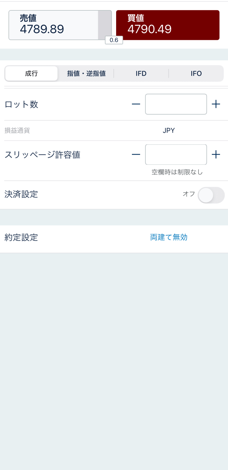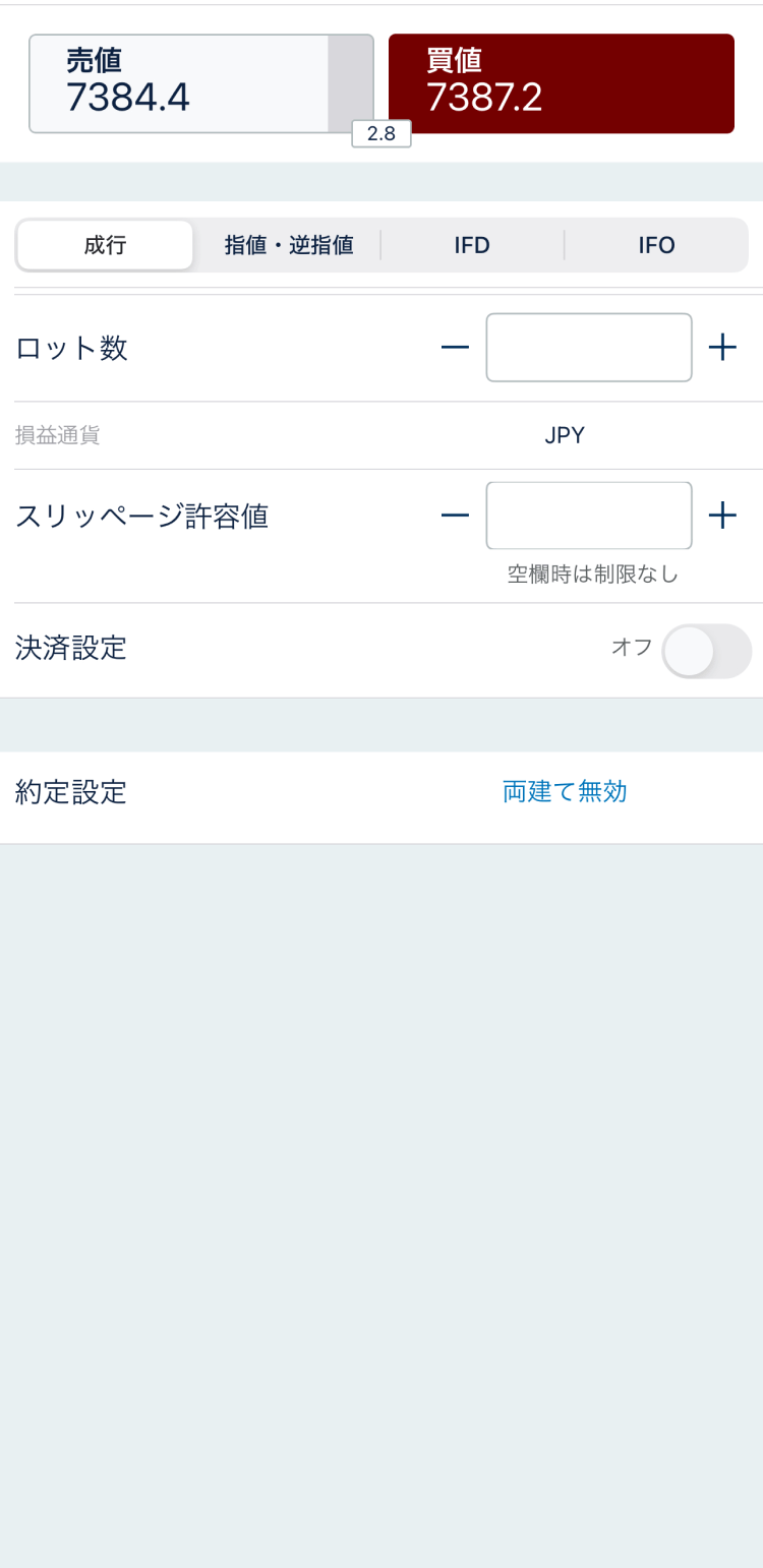 この画面で注文方法の指定や注文数(ロット数)を指定します。