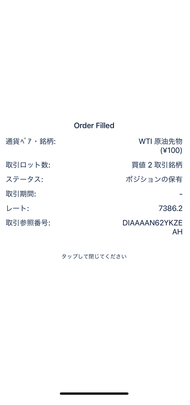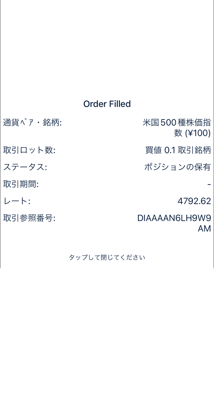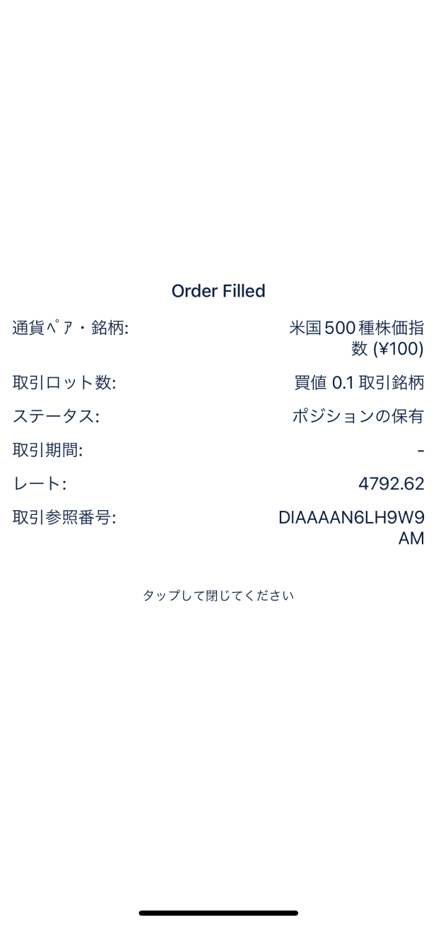 取引が完了すると「Order Filled」画面が表示されます。画面内のどこかをタップして銘柄リスト画面に戻りましょう。