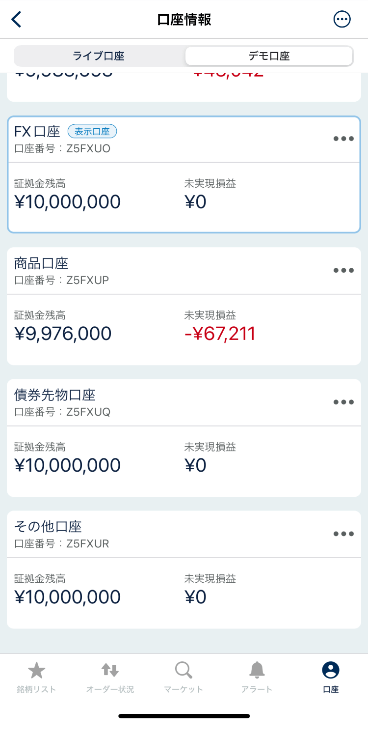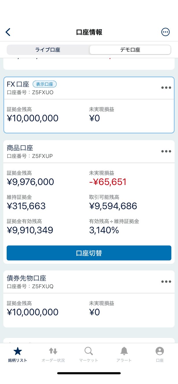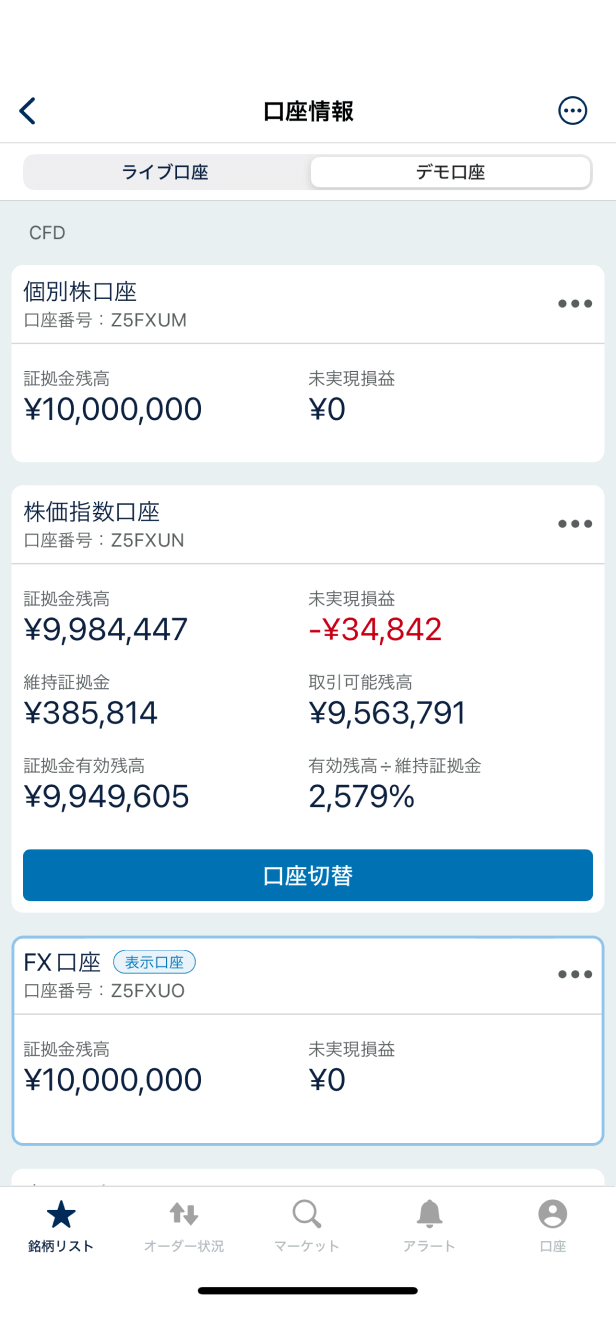 まず、画面右下の「口座」をクリックして「口座切替」メニューをクリック、次に表示された画面で「株価指数口座」セクションにある「口座切替」をクリックしましょう。