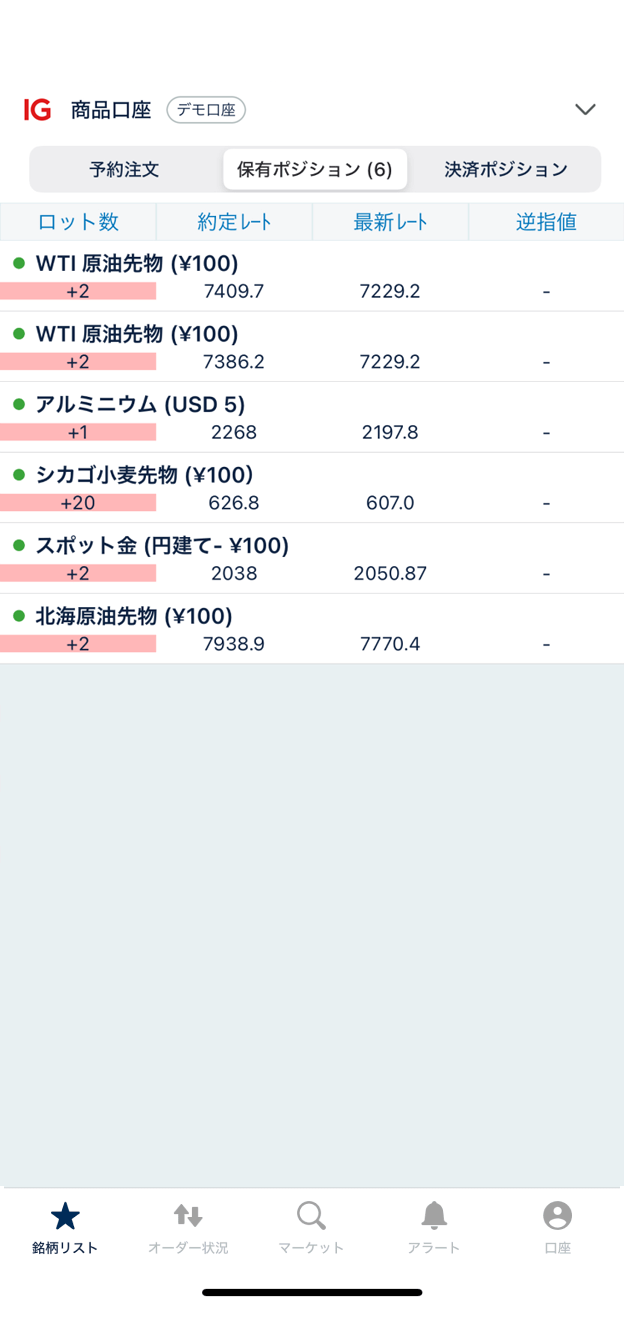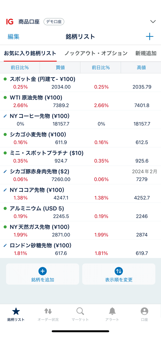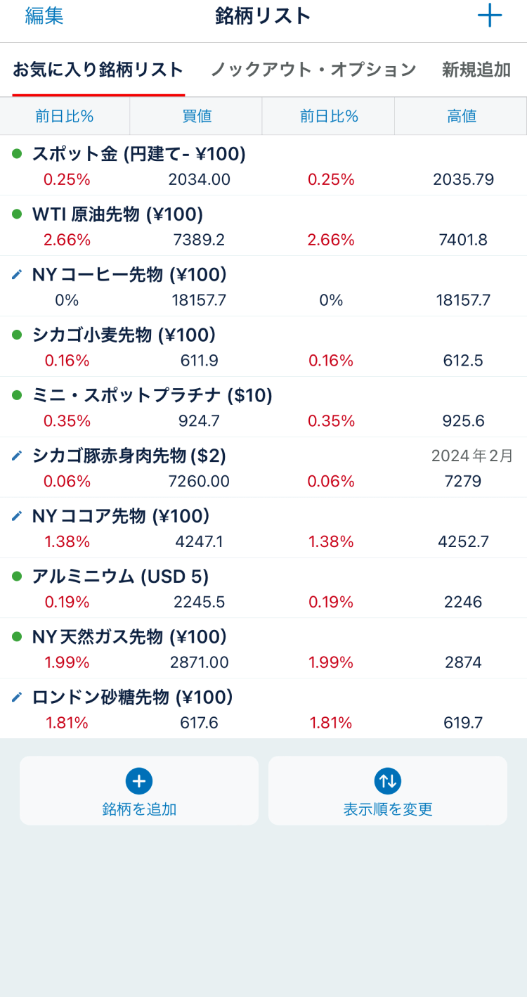 商品口座に切替わりました。「銘柄リスト」を開き、取引する銘柄を選びます。
