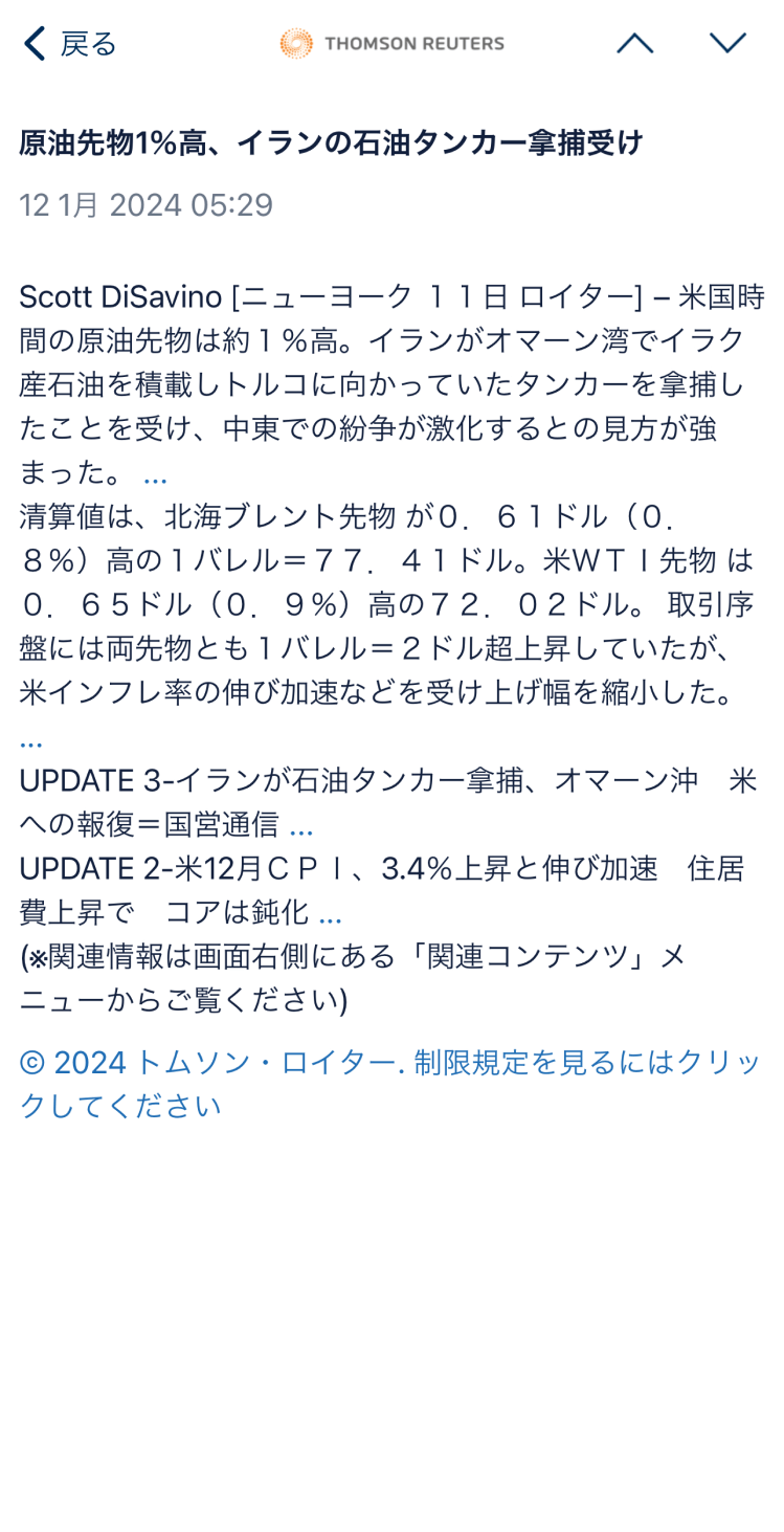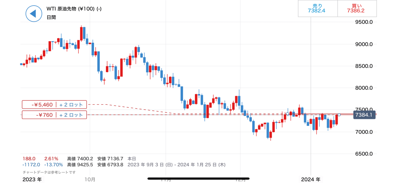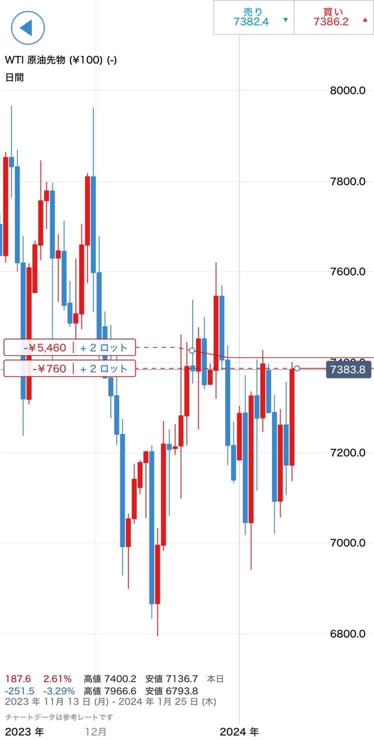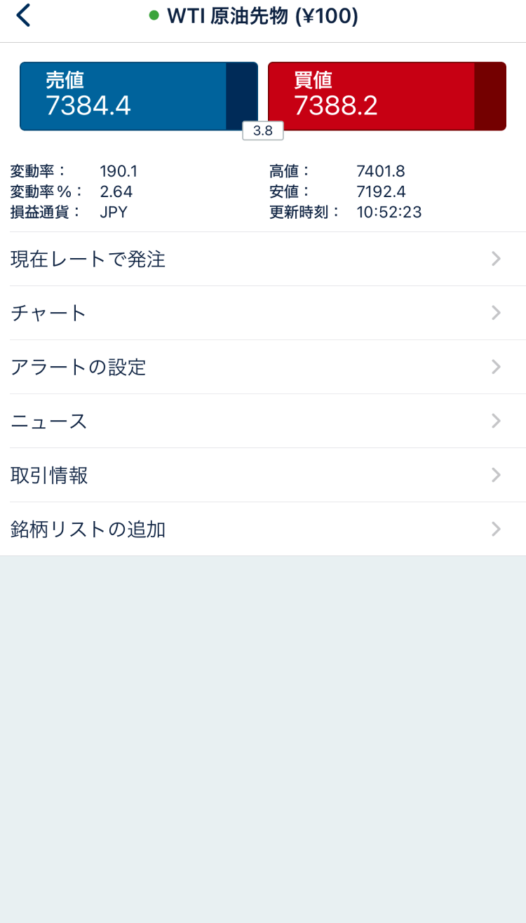 この画面では、現在の「買値」「売値」から、「WTI原油先物(¥100)」銘柄のチャート、関連ニュースまで見ることができます。